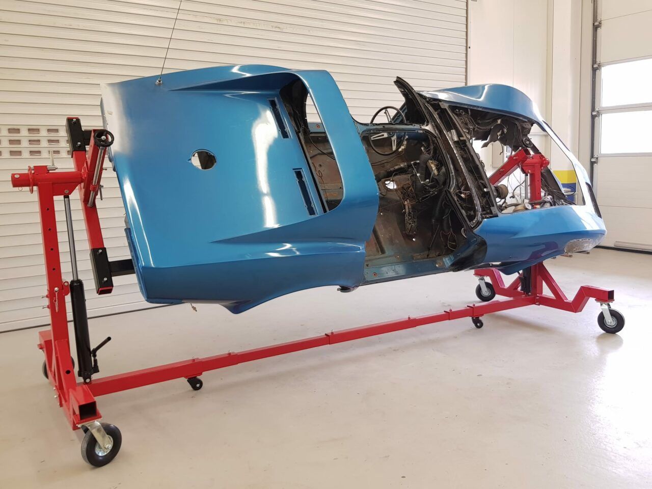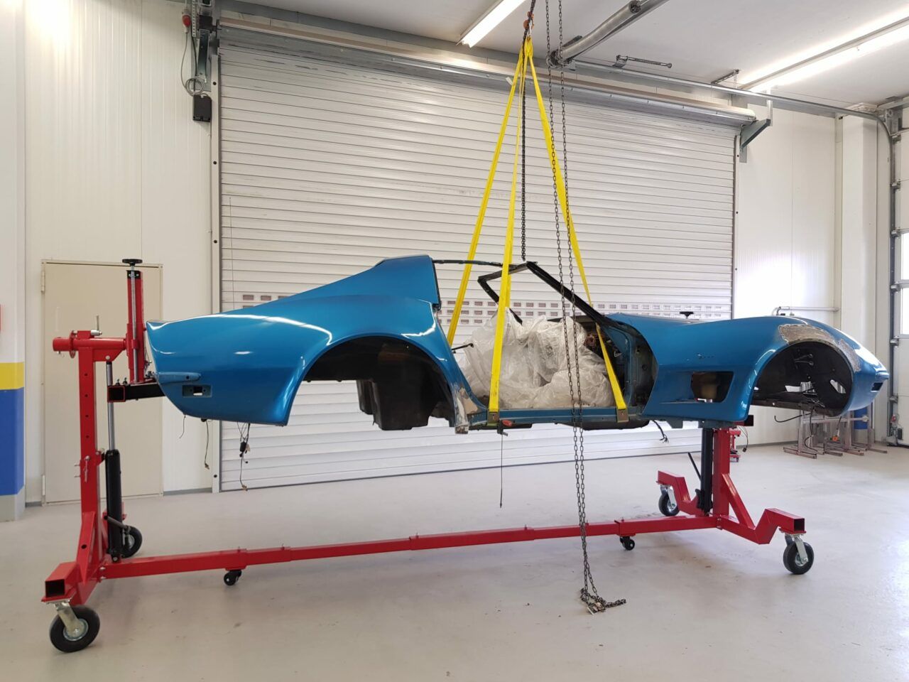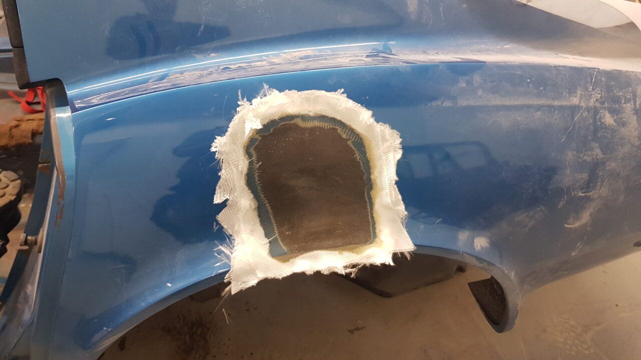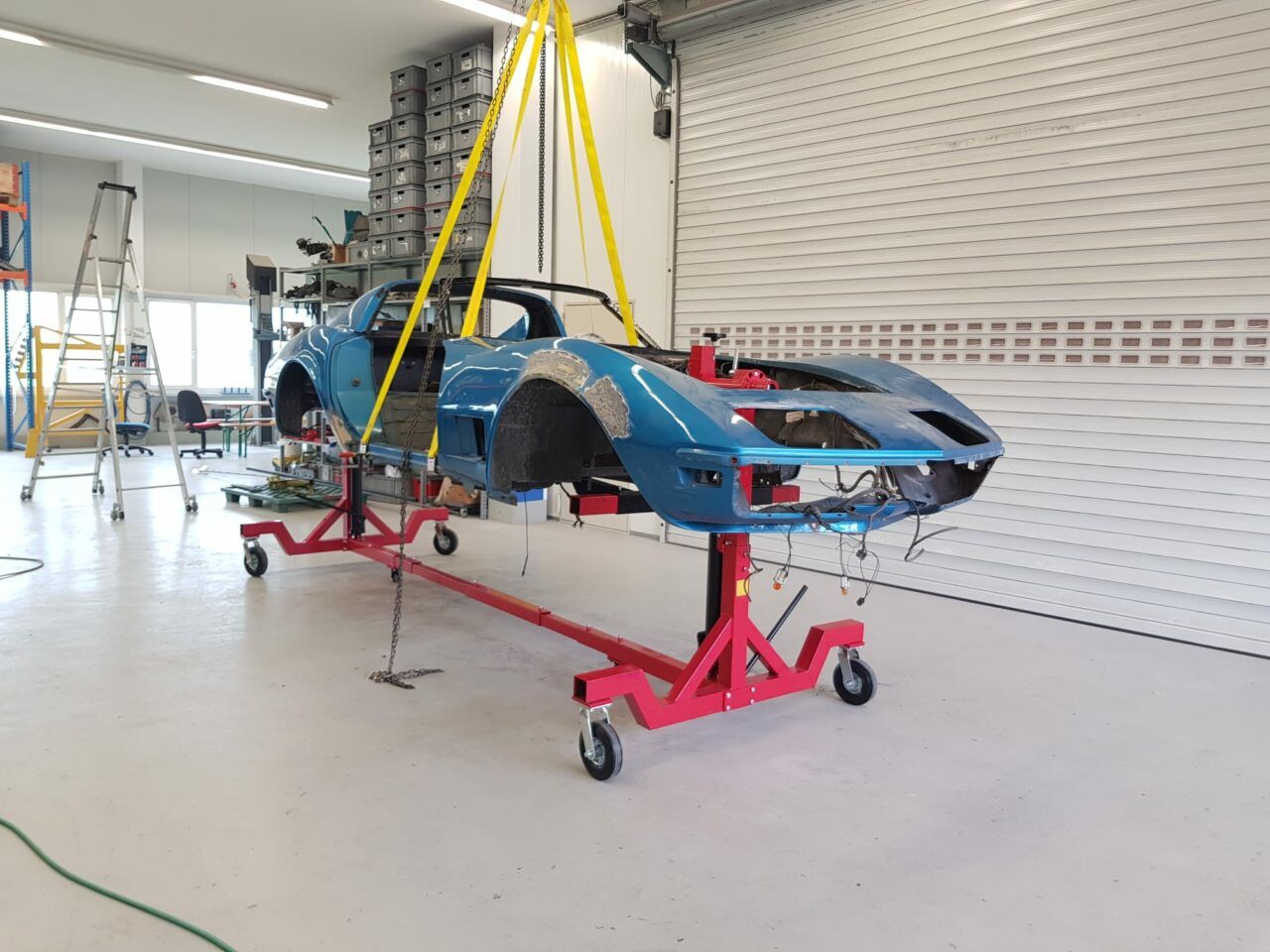 Auch die Kunststoffkarosserie des Chevy Corvette C3 Jahrgang 1970 wird nach der Demontage wieder aufgefrischt. Risse in der Glasfaser Karosserie werden ausgeschliffen, mit Gewebe und Harz wieder verfestigt und auf Kontur verschliffen. Bis zum Finish braucht es noch ein paar weitere Arbeitsschritte.
